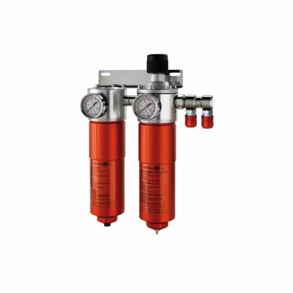 FILTRO BRONCE SINTERIZADO (8 MICRAS) + FILTRO PURIFICADOR REGULADOR CON FILTRO COALESCENTE (0.01 MICRAS), REGULADOR DE PRESIÓN Y MANÓMETRO, DOBLE SALIDA DE AIRE, SISTEMA DE PURGA AUTOMÁTICA, RETENCIÓN DE AGUA E IMPUREZAS. (99%).