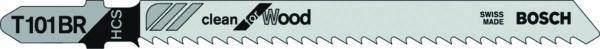 La hoja de calar T101BR Clean for Wood hace cortes rectos limpios en la madera. Los dientes de precisión con un cuerpo cónico producen resultados limpios. El diseño del diente inverso corta sin rasgar la superficie superior. La cuchilla de acero al carbono (HCS) es ideal para madera blanda y materiales de madera no abrasivos. La cuchilla está equipada con un paso de diente progresivo delgado (2.5 mm) para cortar materiales de madera de 3-30 mm. Para usar con sierras de calar compatibles con encastre T.